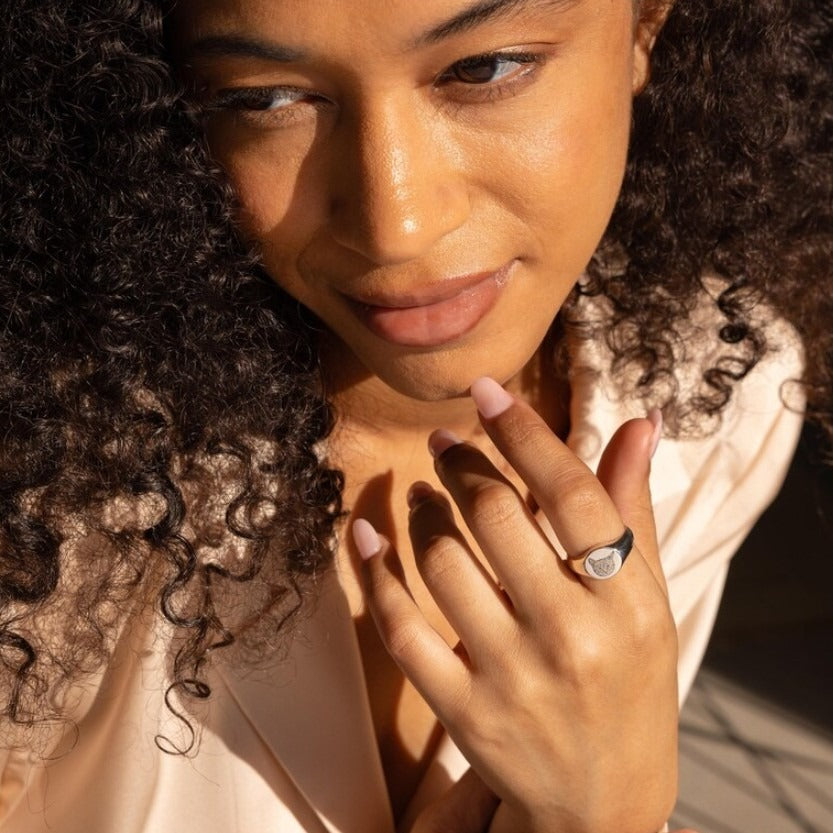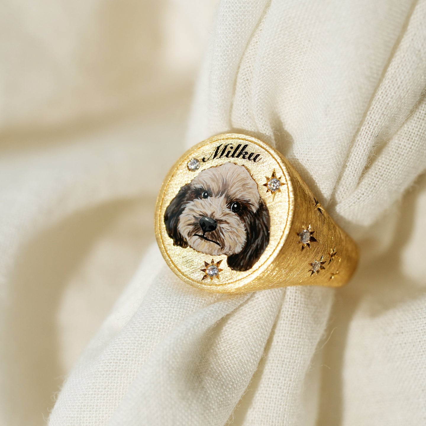 - Custom engraved signet ring featuring your pet’s portrait.